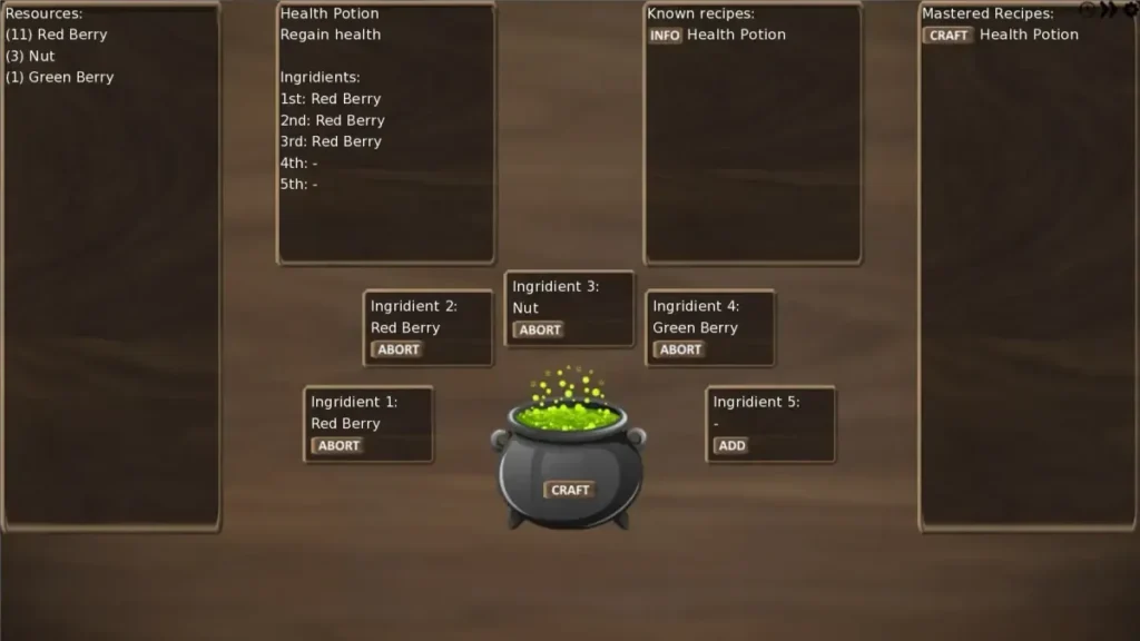 * Healing Salve: A lifesaver. Gather Herbs from forest paths and mix them at a campfire.