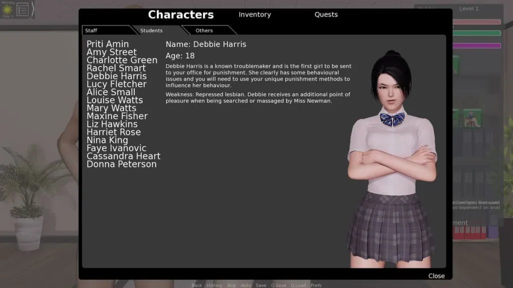 You’ll spend your time between key locations like your office, the classrooms, and the grounds. Your in-game journal is your best friend—it tracks active quests, clues about the investigation, and student information. Early on, you’ll encounter iconic interactions, like the opportunity to inspect Liz’s underwear during a uniform check (SCH01). These aren’t just random events; they’re woven into the fabric of student personalities and your growing authority. I love how these small choices impact school reputation in subtle but significant ways, opening or closing future paths.